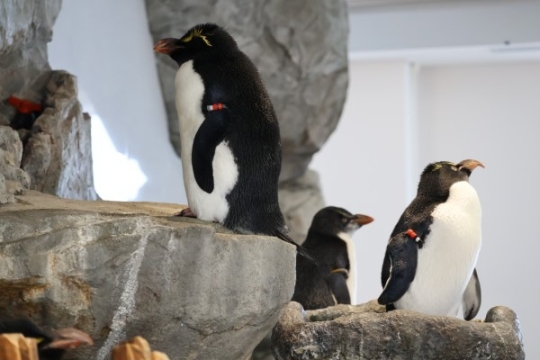 海遊館のイワトビたちを観察してみましょう。手前に立っている2羽と奧の1羽とは雰囲気が違います。配色も...