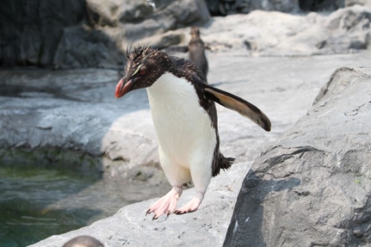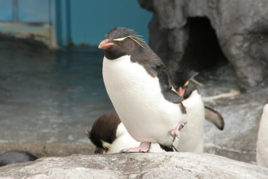 長崎ペンギン水族館、屋内プールの高いところに陣取るイワトビ。眉の端から垂れ下がる飾り羽がゴージャスな...