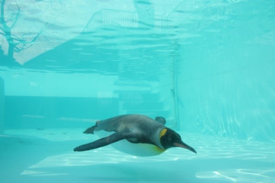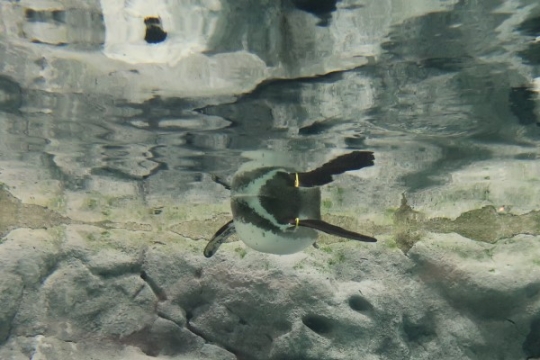 八景島シーパラダイスのキングとジェンツーが、泡をなびかせ影をお供に、優雅に泳いでいました。
