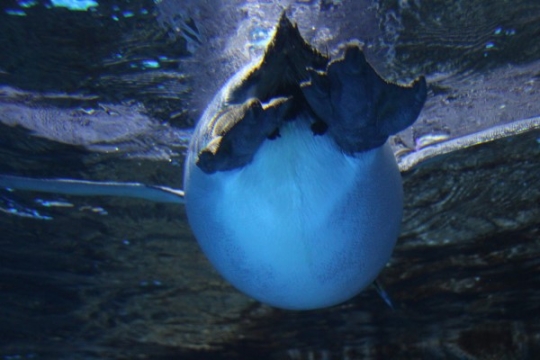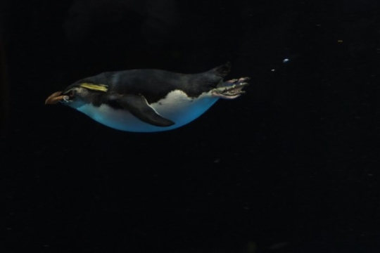 アクアパーク品川のイワトビ、水中を進みながら息を吐いているようです。クチバシの隙間から出た泡が、ぽつ...