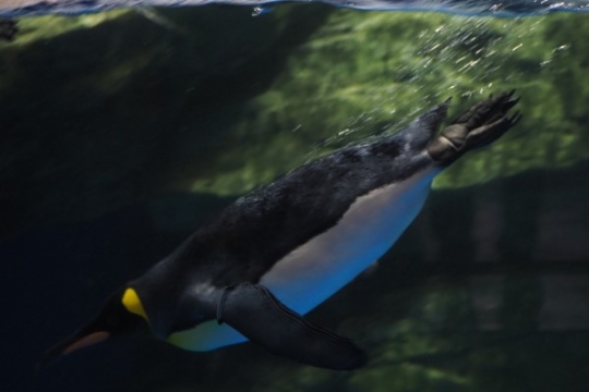 ペンギンの水中姿観察、こちらはキング。同じくアクアパーク品川です。キングの足は表も裏もまっ黒。ペンギ...