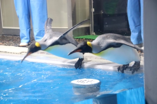 上越水族館のマゼラン、飛び込みます。まずは構えて、ーーーーーーーーーーきれいに身体を伸ばして、水に突...