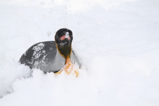 旭山動物園キング、トボガンで深い新雪を爆進中。勢いよく雪が舞い上がっています。ペンギンのトボガンすべ...