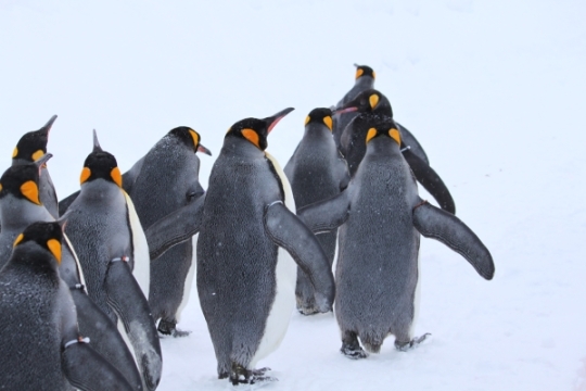 おたる水族館の雪上散歩に飛び出してくるジェンツー、元気いっぱいです。雪の上にクッキリと目立つオレンジ...