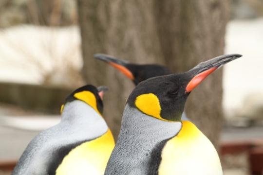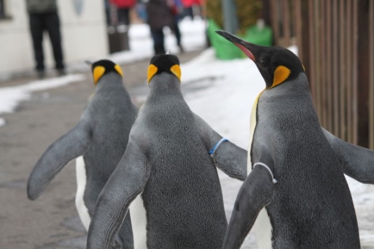 ジェンツーに言い負かされてたじろいでいるふうに見えるキング。旭山動物園のペンギン散歩にて。