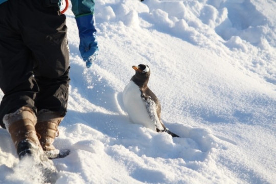 旭山動物園のペンギン散歩で雪道を疾走するジェンツー。さすがに最速のペンギン、速い!独走態勢です!ーー...