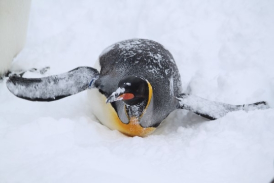 旭山動物園冬の名物ペンギン散歩に出かけるキングたち。雪が多かったので、放飼場は圧雪スロープになってい...