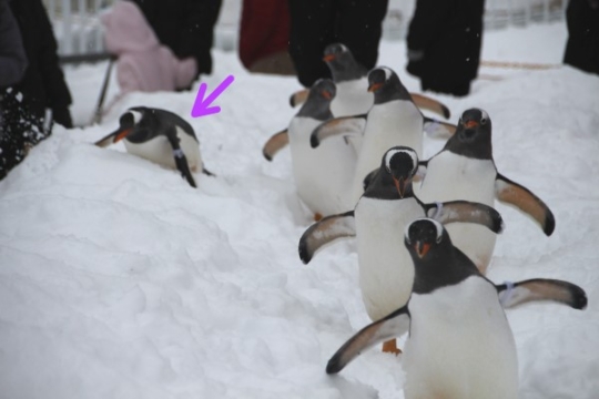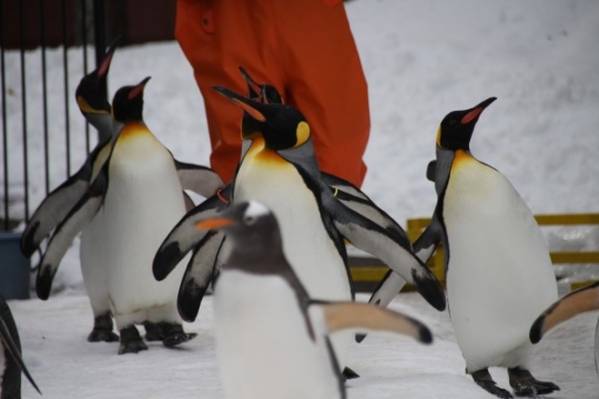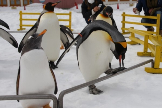 登別マリンパークニクスのペンギンお散歩、路面は圧雪と凍結。あっ危ない! 右端のキングが段差で足を滑ら...