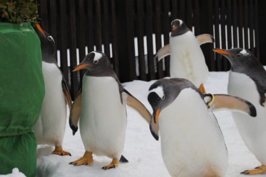 おたる水族館のペンギン散歩、雪の広場で自由気ままに遊ぶジェンツーたち。巨大鏡餅型雪像から美しい姿勢で...
