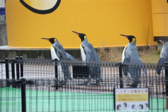 前回からニクスの続き。さて、広場に到着したペンギンたち、慣れているので余裕です。1羽のキングは柵に足を...