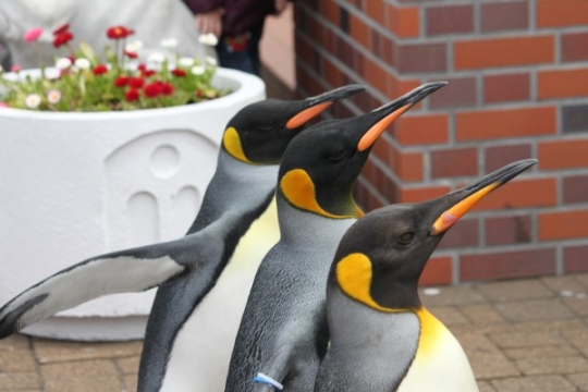 キッチリ揃って歩くお散歩キング、背景がレンガ色だと秋めいて見えます。実際は5月。@登別マリンパークニクス