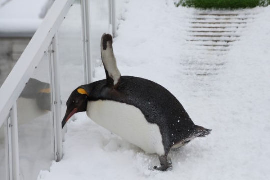 あ、あぶない! 旭山動物園、トボガン広場につながる下りスロープで足をすべらせた亜成鳥キング。とっさに...