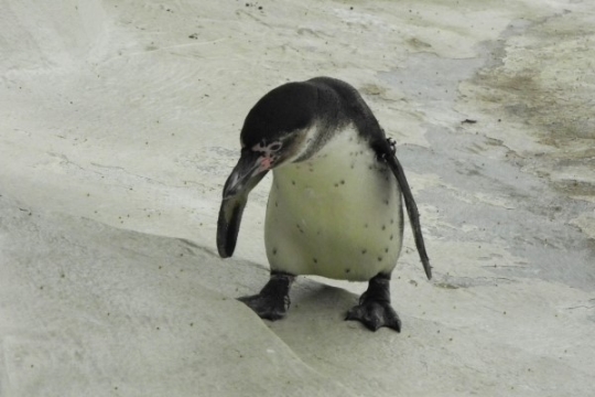 フンボルト亜成鳥、つるつるの岩山に挑むふう。天王寺動物園のペンギンプールは、コンクリートに白塗り。階...
