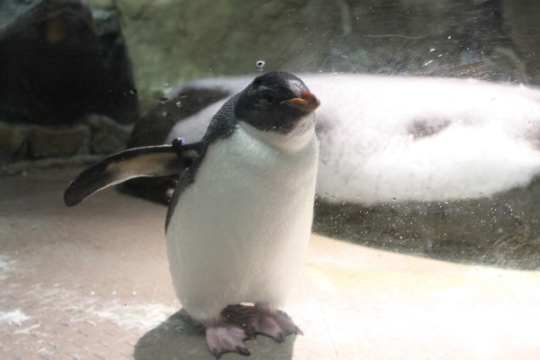 こちらは海遊館のアデリー亜成鳥。ノビをして目をむいているので白目が出ています。そのうえ顔が上下白黒に...