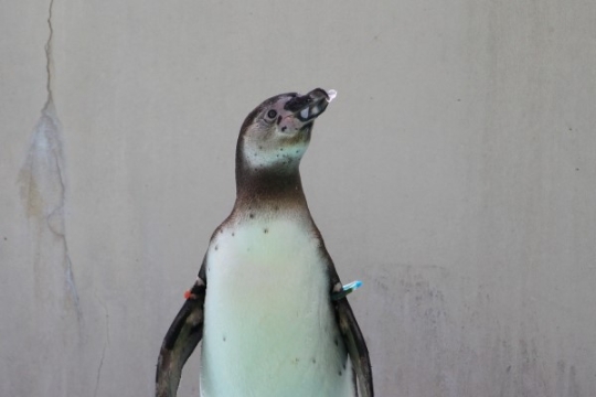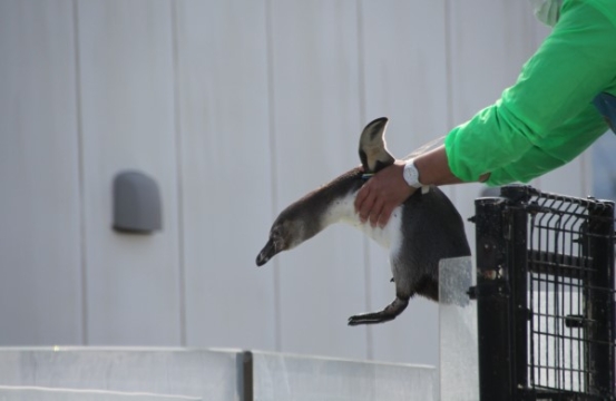 はい、今日はよろしくね。越前松島水族館の空中プールでは、日替わり当番でフンボルトが2羽泳ぎます。キュー...